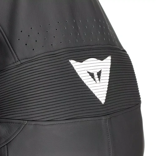 Heldress i perforert Tutu okseskinn, med skulderplater i aluminium og aerodynamisk pukkel designet for å romme et vannposesett. Daineses racingikon.