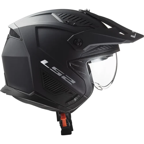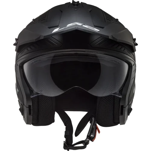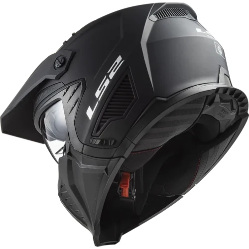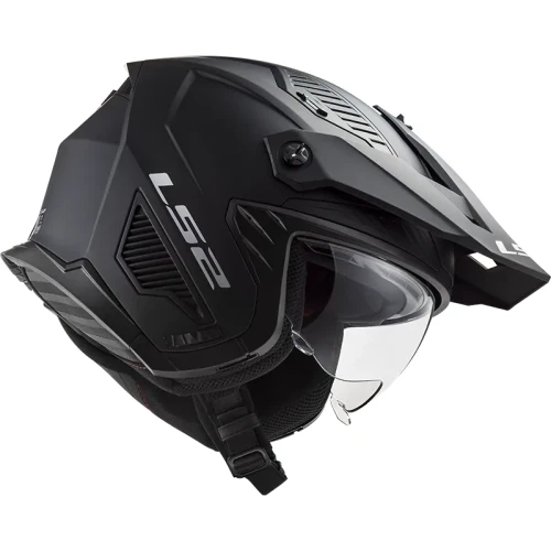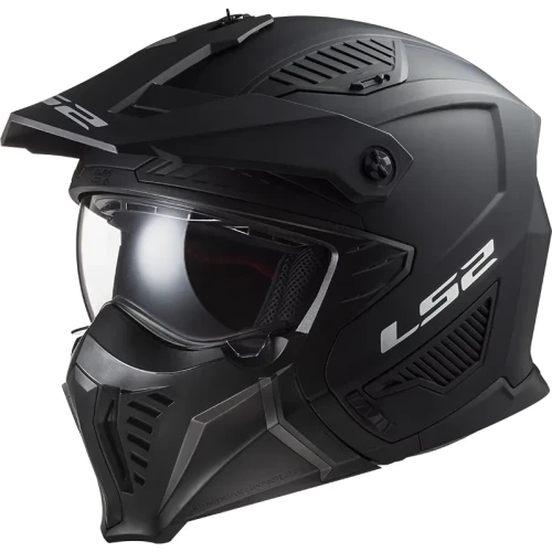 LS2 Drifter. En allsidig hjelm, den gir muligheten til å kunne kjøre med eller uten maske, avhengig av situasjonen. Veldig enkelt å ta av med et dobbeltklikk på to nettsteder. LS2-visirer er bygget med 3D optisk korrekt "A Class" polykarbonat, med høy motstand mot slag, som unngår forvrengning og gir maksimal klarhet.
