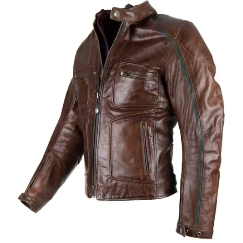 By City Le Mans II skinnjakke brun. Jakke i klassisk stil laget av høykvalitets okseskinn. Den har en vanntett Hipora®-membran og avtagbart termisk fôr for å tilpasse seg forskjellige værforhold. Den har nivå 2-sertifisert beskyttelse på skuldre og albuer.