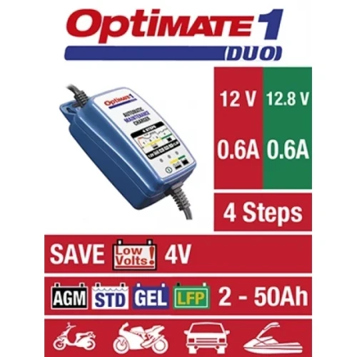 - Interaktivt "stand-by" ladning etter at batteriet har blitt brukt eller trenger ladning. Optimate 1 lader det automatisk til toppnivå og beholder det på topp med vedlikeholdsladning.