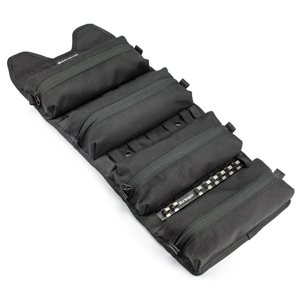 Roland Sands Design X Kriega Roam Tool Roll er kjekk å ha med på enhver tur. Oppbevar den i bagasjen eller monter den på sykkelen med Velcro® Molle-systemet. Løsne spennene og rull ut for å se fire YKK®-glidelåslommer, 10 elastiske løkker og en T6-legeringsskinne med 8 x 3/8" klips for pipenøkler. Holdere for 1/4" og 1/2" pipenøkler kan kjøpes separat. Tilgjengelig i 2 fargealternativer: Sort eller Ranger.