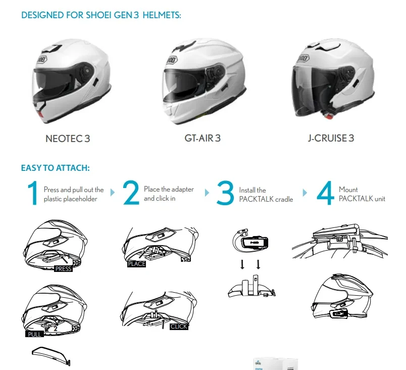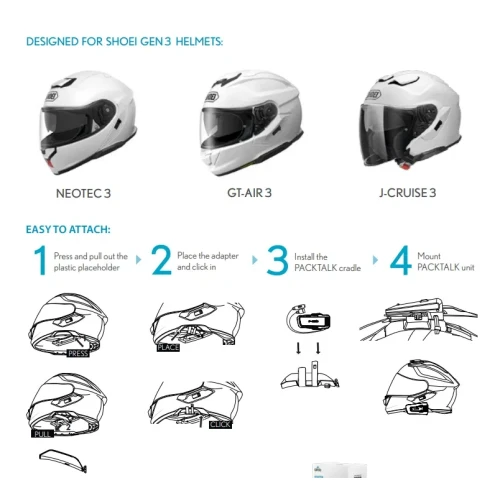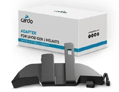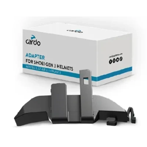 Braketten klikker lett inn i SRL3 sporet på venstre siden av Neotec 3, GT-Air 3 og J-Cruise 3 og gjør monteringen av Cardo på Shoeihjelmer til en lek. Den passer til Cardomodellene PT Pro, Edge og Neo.