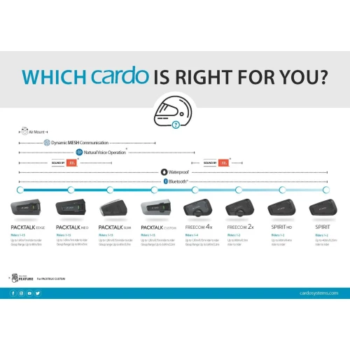 Rimelig og bra kommunikasjonssett med blåtann 5.2 fra Cardo for 1-2 personer på inntil 600m. Fører/fører eller fører/passasjer. 40mm HD høyttalere, opp til 13t tale og hurtiglading. Vanntett. Kan brukes mot alle andre merker blå- tann, telefoner, GPSer og TFT. Musikkdeling, VOX (voice operating) og kan styres via Cardo sin app. OTA oppdatering.